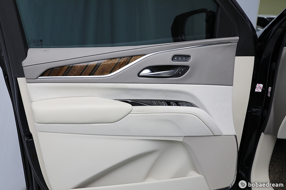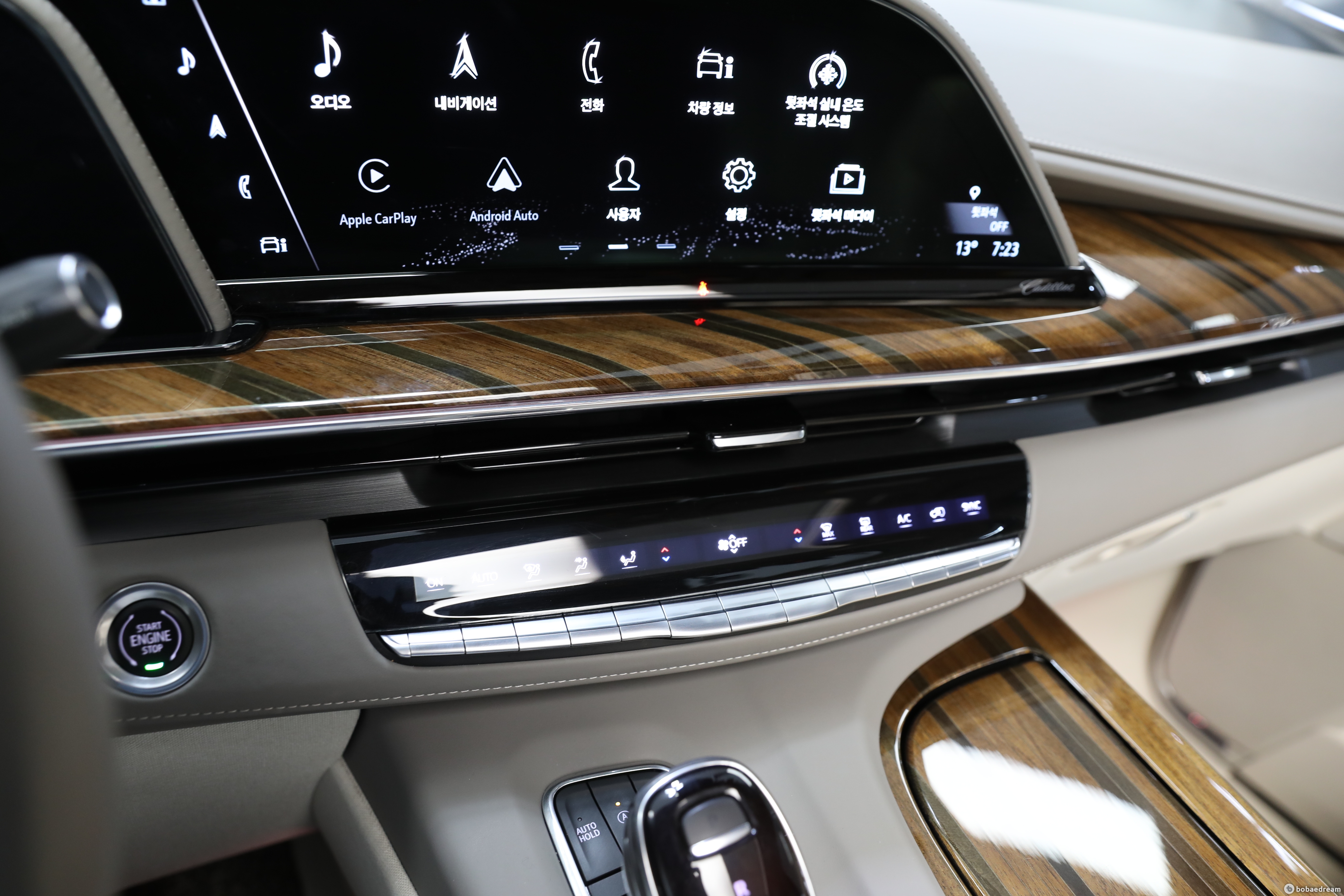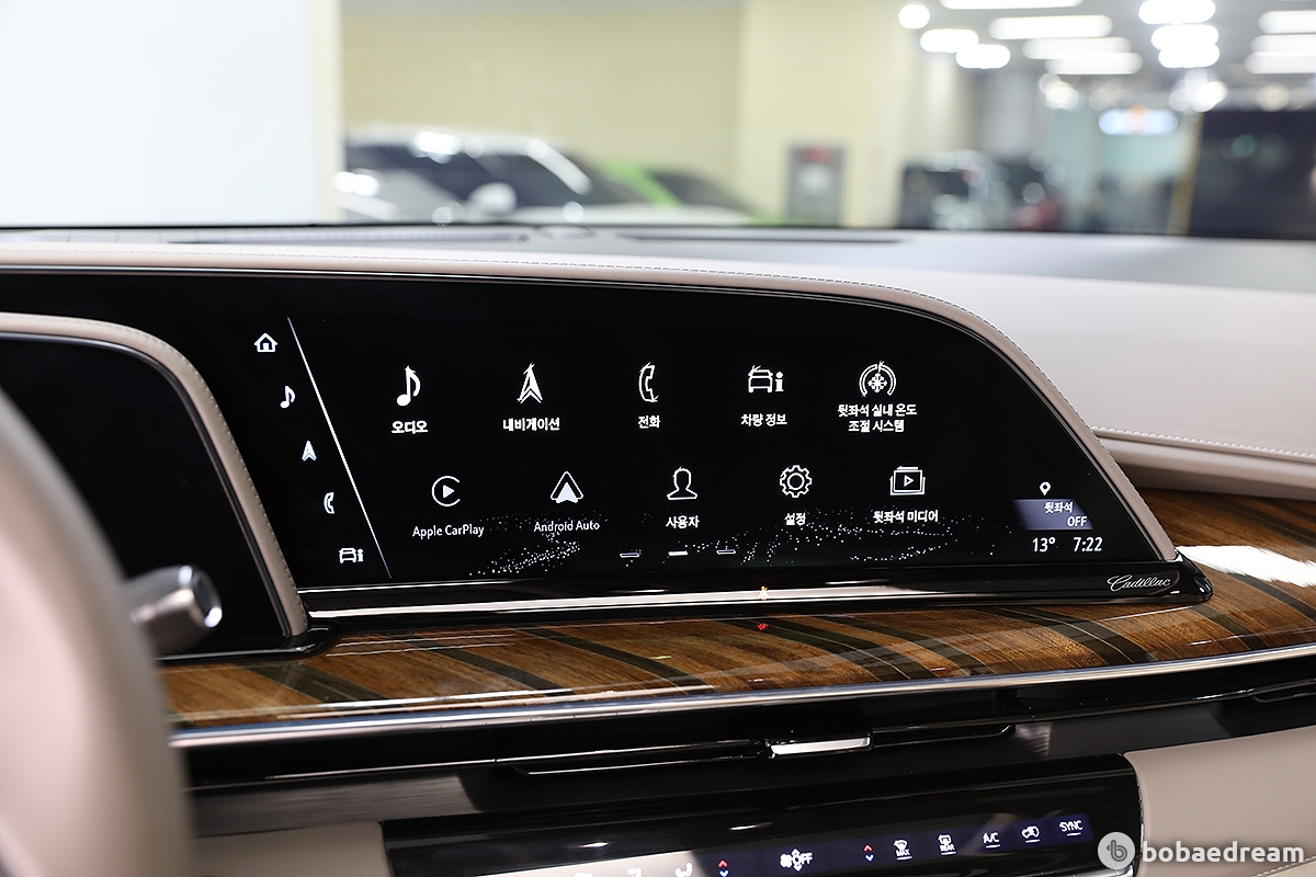 대시보드와 콘솔부, 도어의 안쪽에는 원목 소재가 광범위하게 사용됐다. 캐딜락은 센터페시아에서