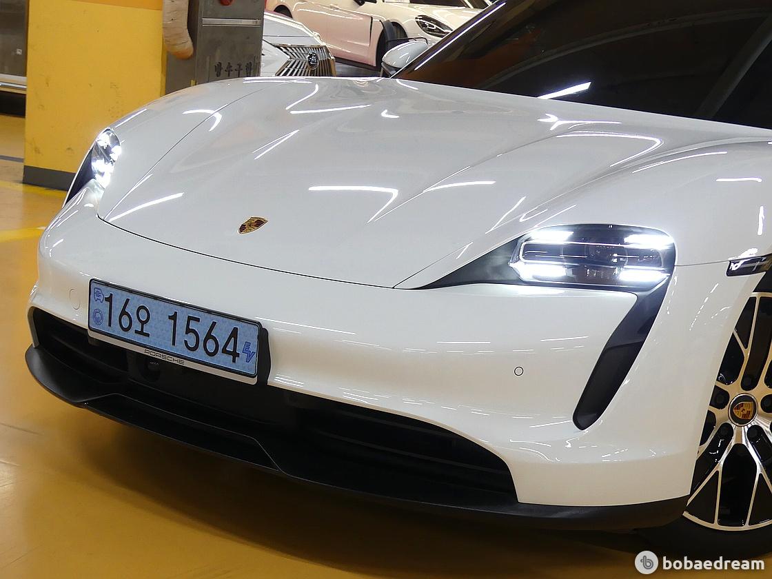 타이칸 베이스의 전면은 윤곽이 뚜렷한 윙과 함께 낮고 넓어 보이고, 실루엣은 후면 방향으로 경사진 스포티한
